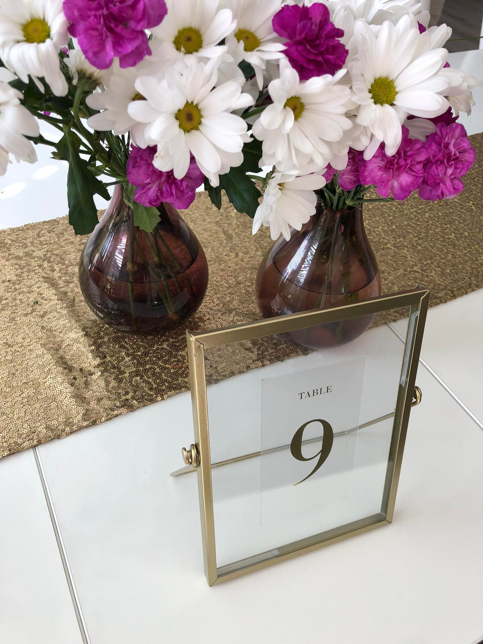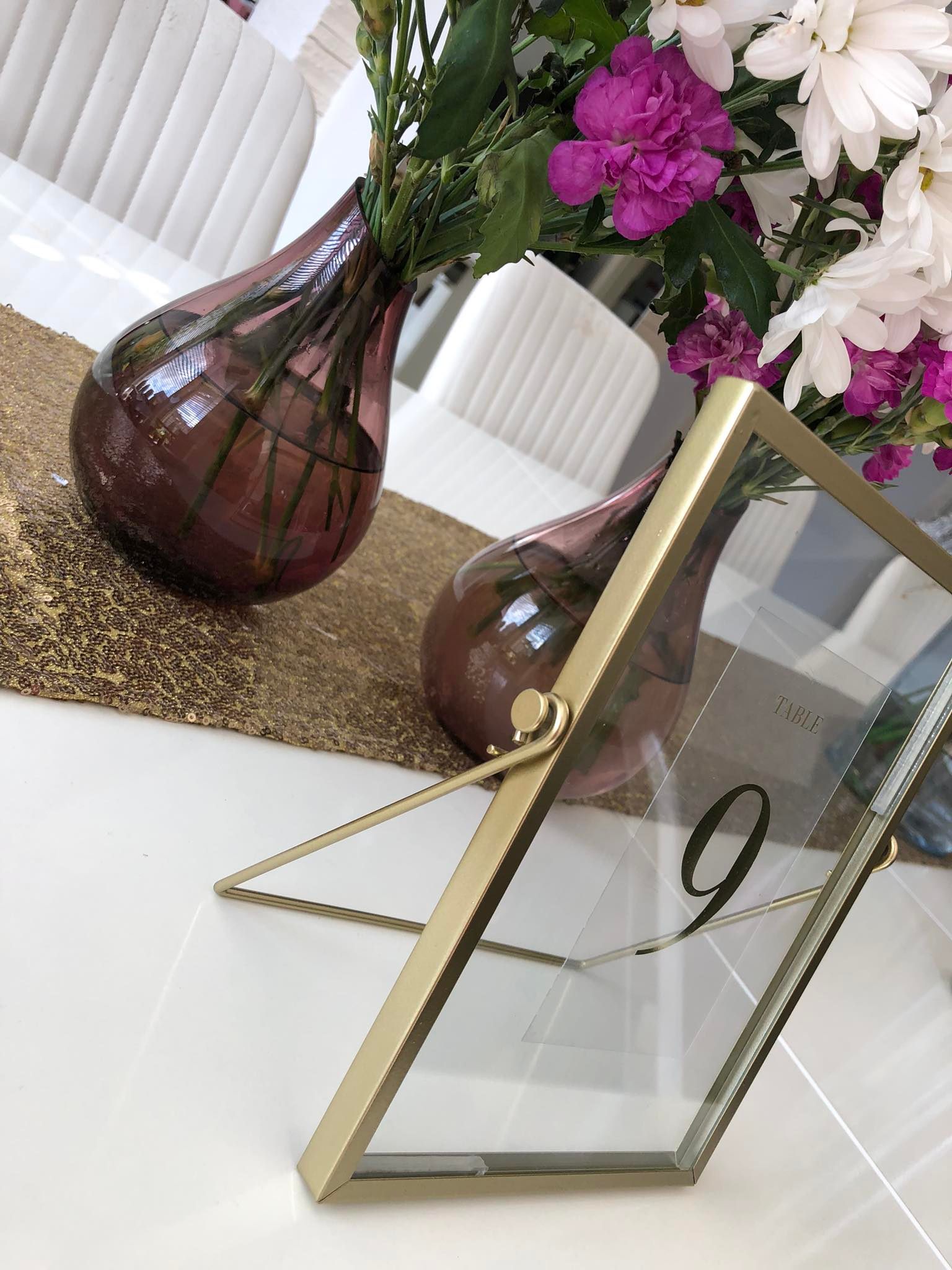 Numerki na stoły umieszczone w złotych ramkach to elegancki i stylowy sposób na oznaczenie miejsc dla gości na weselu. Dzięki nim ułatwisz swoim gościom odnajdywanie swoich miejsc przy stole.