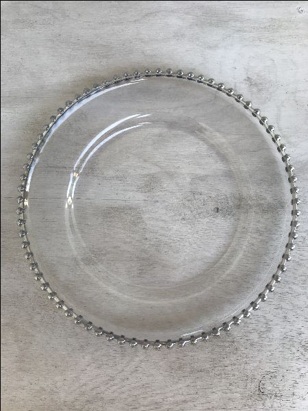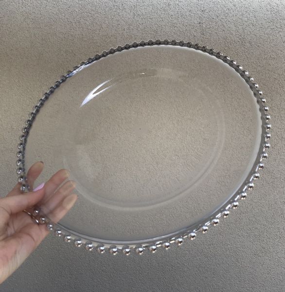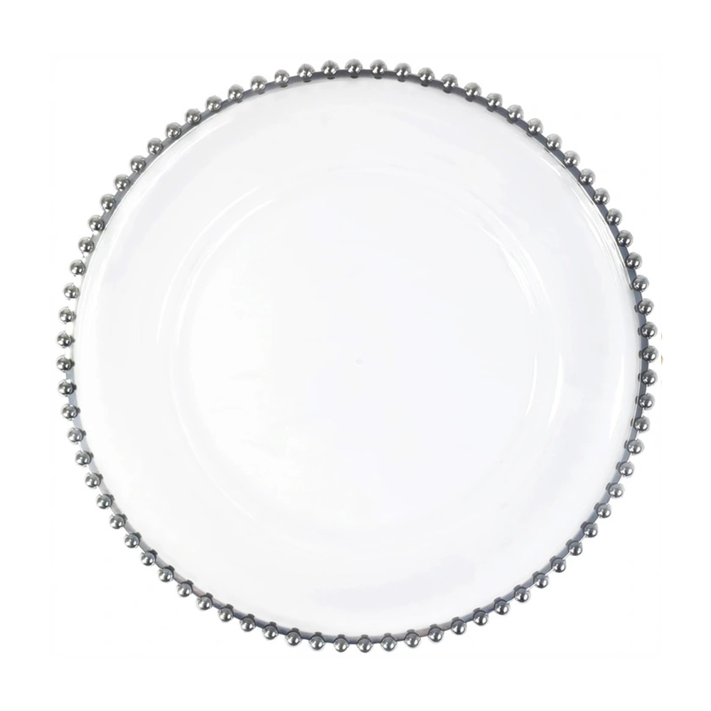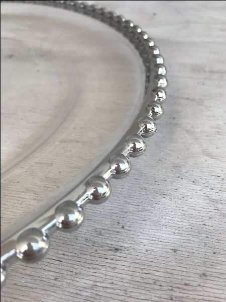 Transparentny podtalerz ze srebrnymi kuleczkami, idealnie się sprawdzi do prezentacji dań oraz wzbogaci aranżację przyjęcia.