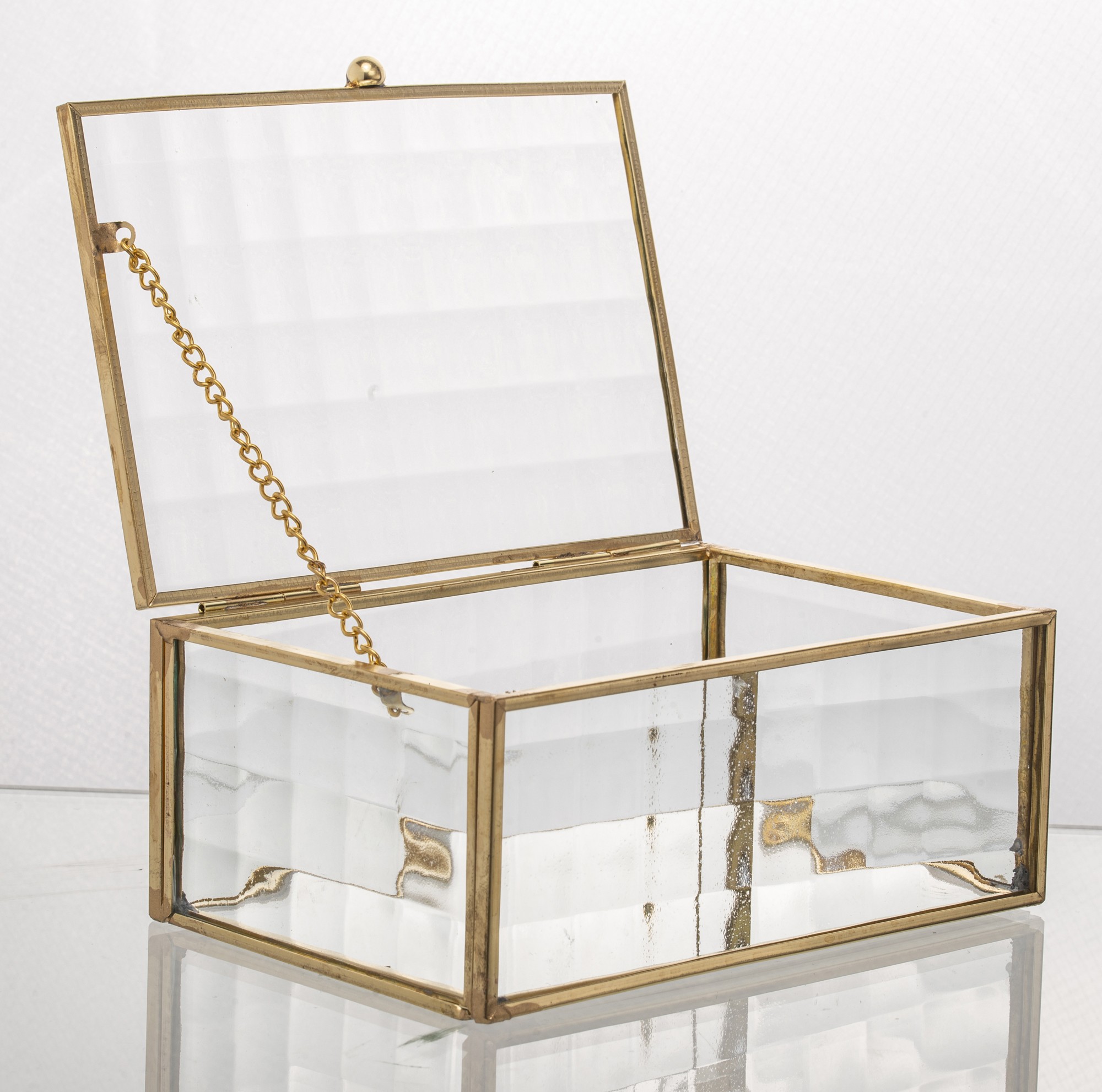 Szkło wykonane w szkatułce jest karbowane, a boczne krawędzie są pokryte złotym kolorem.